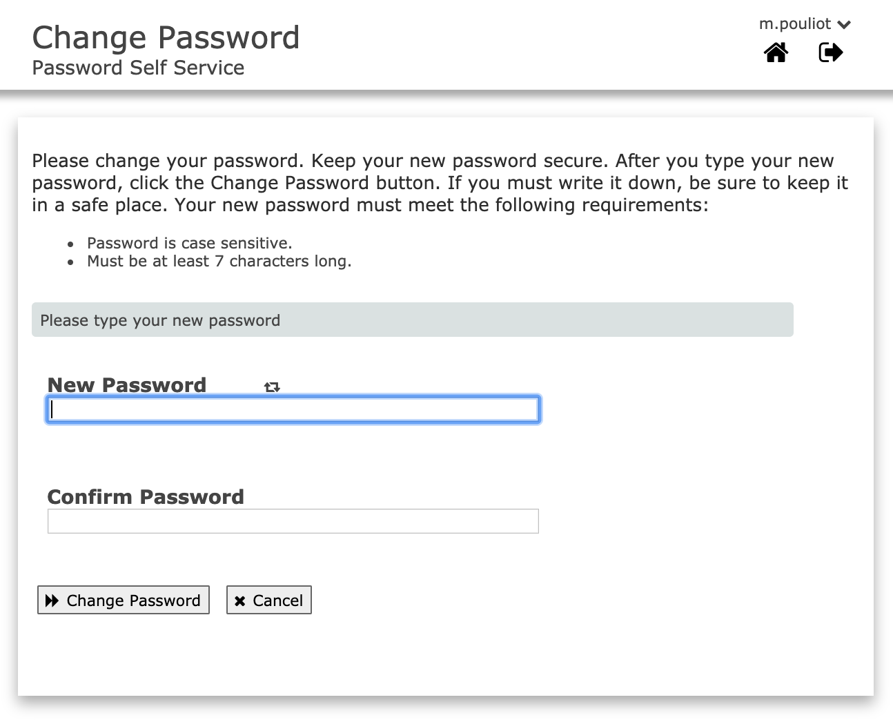 - Le mot de passe choisi devrait avoir une longueur minimale de 7 caractères. Lorsque le mot de passe choisi est suffisant, on peut cliquer sur Change Password. Ce mot de passe sera changé. Veuillez prendre note que l'ancien mot de passe reste valide pour une heure durant le temps de changement. Ceci est une fonctionnalité du système Active Directory qui est utilisé pour l'authentification centralisée.